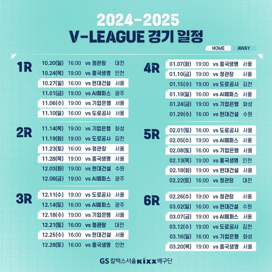 카테고리 없음 [2024-2025 V-리그] GS칼텍스 경기 일정 by ranik 2024. 10. 8. 반응형 [GS칼텍스서울Kixx배구단 𝟐𝟎𝟐𝟒-𝟐𝟎𝟐𝟓시즌 경기 일정]✦ 𝐇𝐎𝐌𝐄 𝐎𝐏𝐄𝐍𝐈𝐍𝐆 𝐆𝐀𝐌𝐄2024년 10월 27일(일) 16:00vs 현대건설 힐스테이트 배구단 반응형 공유하기 게시글 관리 ranik 끄적끄적
